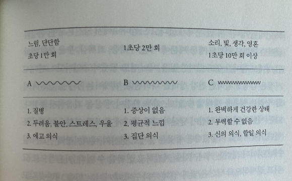 앞 전에 읽었던, 부자가 되는 지혜 책에서는 [생각으로 물질을 창조] 하는데, 이 책에서는 그 생각이 바로 에너지, 주파수, 진동이라고 합니다. 표현하는 법은 다르지만 비슷한 내용이 많더라고요.