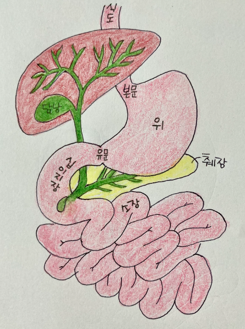 아래에 간단하게 그린 소화기관 그림을 참고해 주세요.