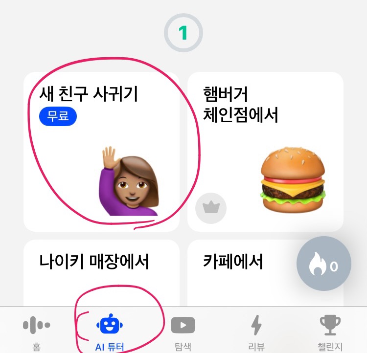 메뉴에서 [오늘의 수업]말고, AI튜터에서 음성인식으로 대화를 할 수 있는 기능이 있습니다. 아래 소개하는 다른 어플과 달리, 스픽의 장점은 못 알아 들었을 때 한국어로도 알려줍니다 ㅋㅋ (번역키를 누르면 한글로 나옴) 그래서 참 좋아요. 뭘 말할지 잘 모를 때는 예상 문구도 알려줍니다.