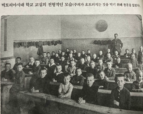 산업화로 피부병, 관절염, 요통, 시력저하 등이 등장했다. 학교는 교육공장이었고, 한 학급인원이 최대 300명, 창문이 높거나 없어서 햇빛도 못 쬐었다. 19세기 초, 영국에서도 교사가 학생을 때려죽이는 것을 금지시키는 법이 통과되었다. p219
