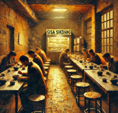 제가 "쓸쓸한 기사식당 + 밀레의 '만종'느낌으로 그려줘"라고 요청했더니 아래와 같이 그림을 그려주네요.