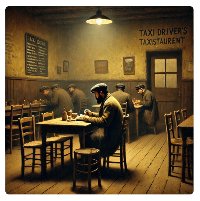 다시 "쓸쓸한 기사식당 + 밀레의 '만종'느낌 +고흐의 붓터치 + 유화로 그려줘"라고 요청했더니 아래와 같이 그려줬습니다.