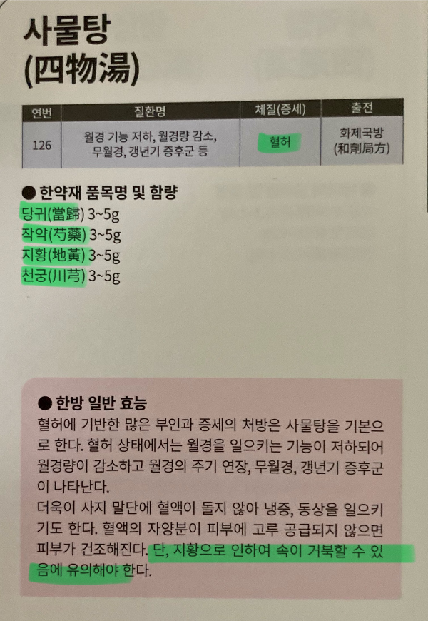 → 사물탕(당귀, 천궁, 작약, 지황)의 4가지 약재는 간 기능, 보혈·양혈·행열작용을 한다.