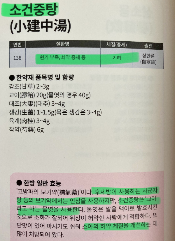 → 소건중탕은 교이(물엿)를 넣어 소아 허약체질 개선에 좋다.