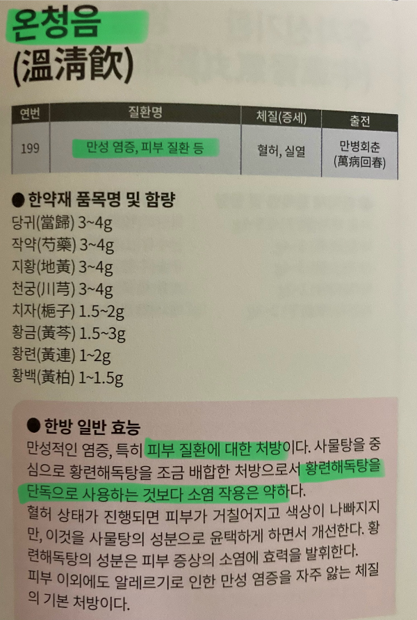 → 당귀음자탕/ 십미패독탕/ 온청음/ 소풍산/ 용담사간탕/ 자운고/ 형개연교탕 / 황련해독탕
