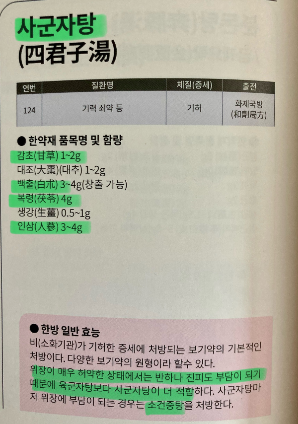 → 사군자탕(인삼, 백출, 복령, 감초)의 4가지 약재는 위장, 소화기관을 튼튼하게 하고 양기를 보충한다.