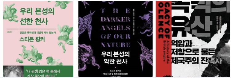 [우리 본성의 선한 천사]_2011 스티븐 핑거_에서는 인간의 6가지 경향성, 5가지 내면 악마(폭력, 경쟁, 복수, 가학, 이데올로기*) 4가지 선한 천사(감정이입, 자기 통제, 도덕감각, 이성), 5가지 역사적 힘(리바이어던*, 상업, 여성화, 세계주의, 이성의 에스컬레이터) 등을 다룹니다.