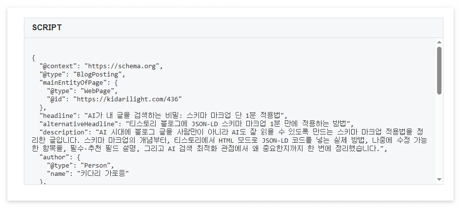 특히 블로그처럼 정보가 많은 공간에서는 AI가 글을 구조적으로 읽을 수 있도록 도와주는 스키마 마크업이 큰 역할을 합니다.