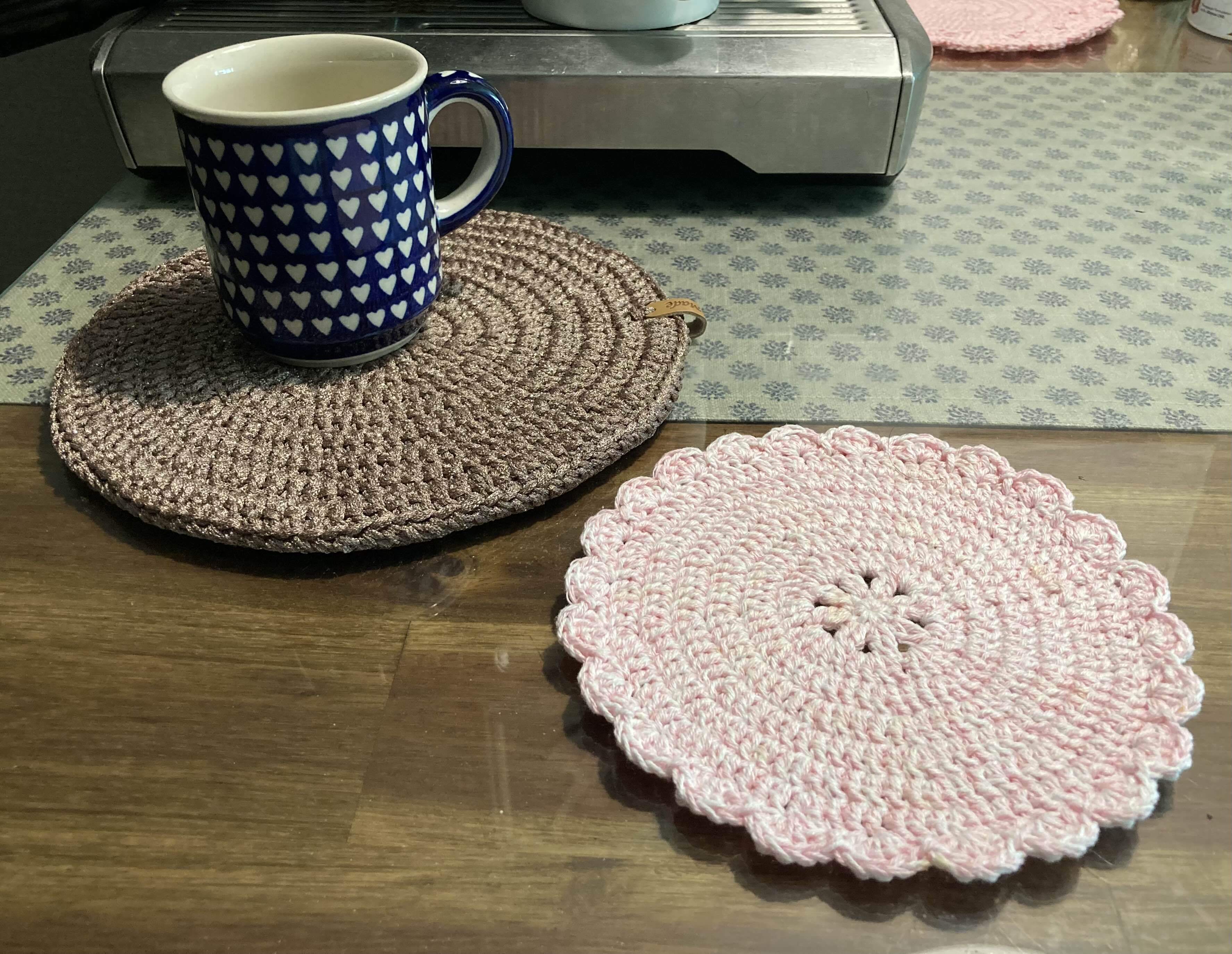 자투리 실로 작은 티코스터를 많이 떴는데, 자주 사용하는 건 오른쪽에 큰 것들입니다.