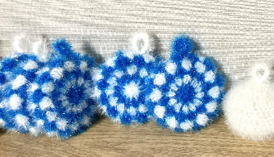 산타는 한길긴뜨기로 물방울무늬로 뜨면 되고, (수염은 흰색 수세미실을 기존실과 더해서 같이 뜸)