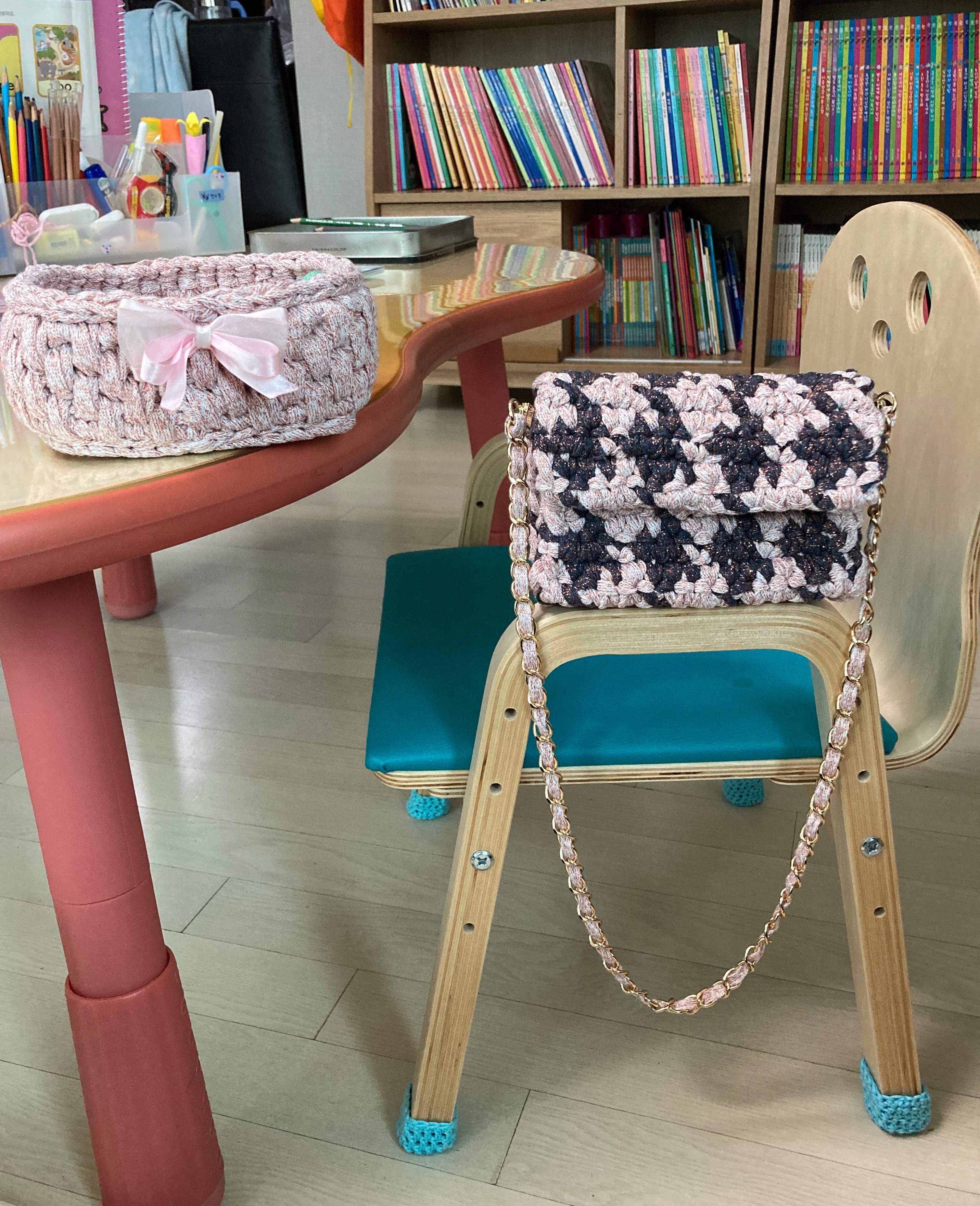 바구니는 "디어 코바늘" , 가방은 "슈퍼 스토리 코바늘" 유튜브를 보고 만들었어요. 아이가 무척 좋아하네요. 아이가 이 가방을 아끼느라 밖에 안 가지고 다니는 거 안 비밀요.