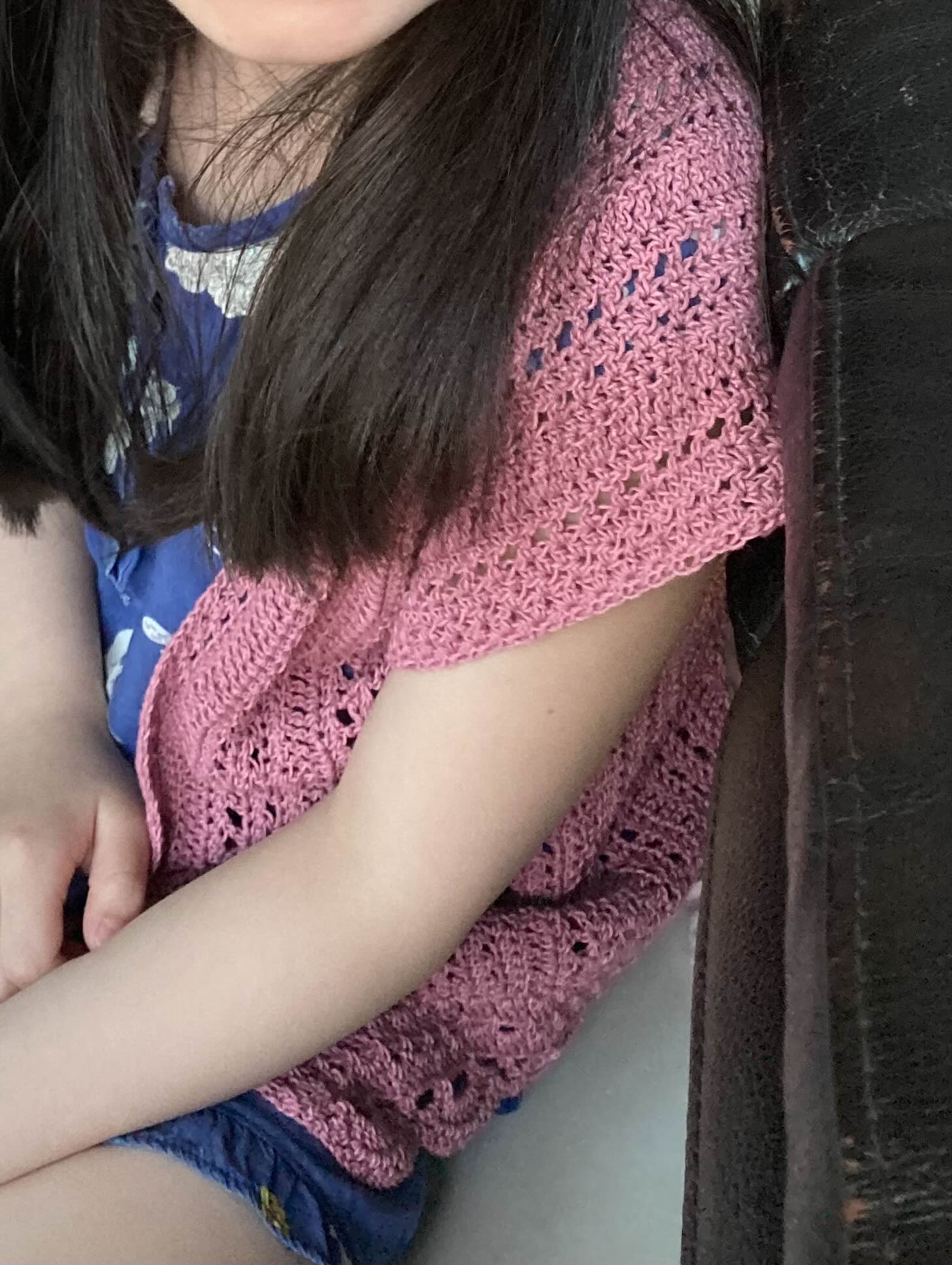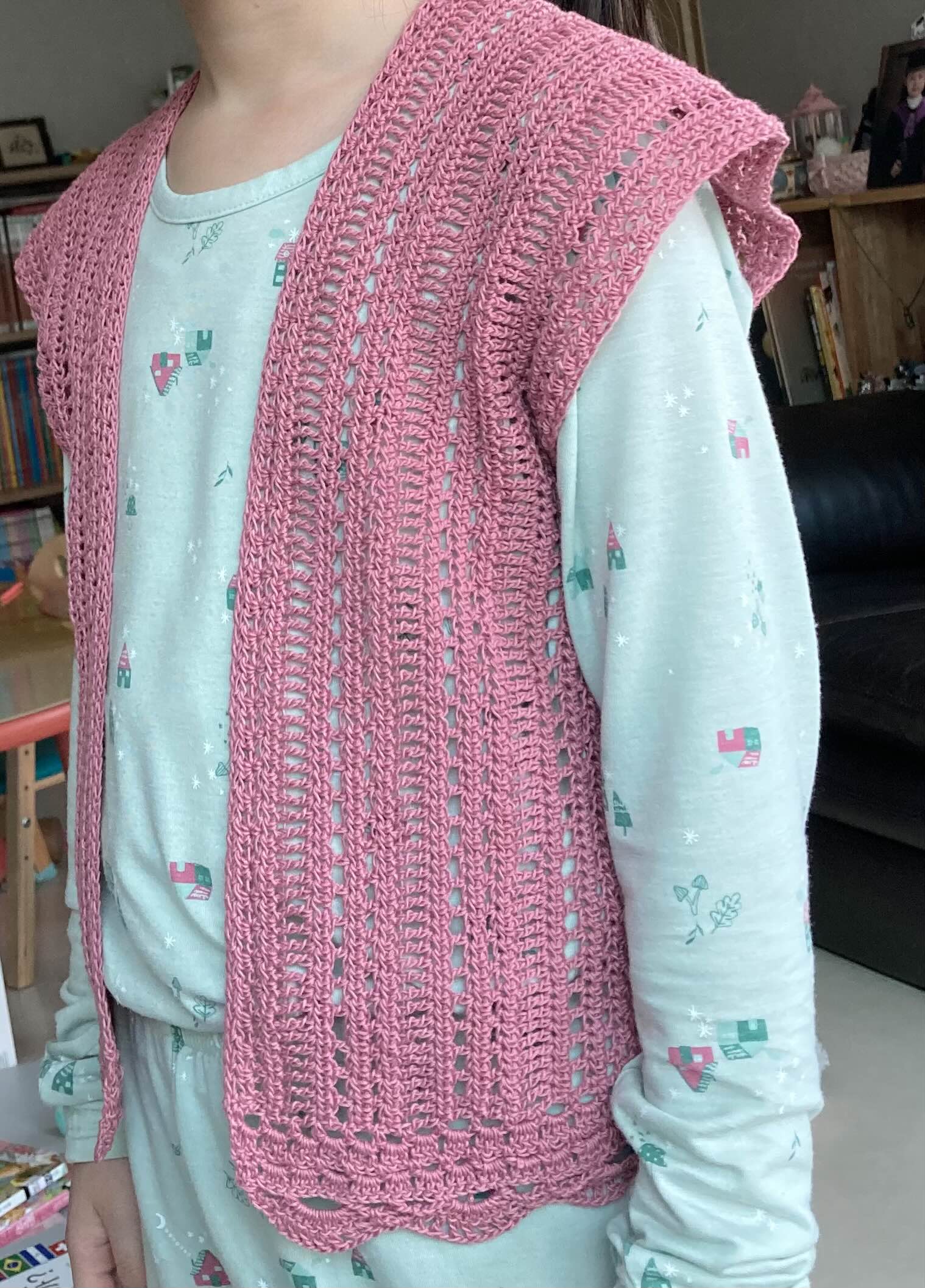 초보들이 가장 쉽게 도전할 수 있는 것이 아이용품입니다. 작아서 금방 뜨거든요. ^^ 디어코바늘 유투브에서 본 조끼 콧수 그대로, 가느다란 씨원씨원 실 두볼로 떴어요. 이걸로 뜨면 아이용으로 딱일것 같아서요. 어깨도 살짝 내려와서 좋네요.