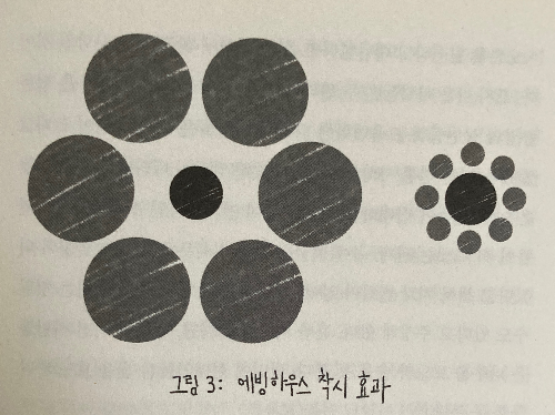 위 두 그림의 한가운데에 있는 두 개의 검은 원 중 어느 쪽이 커 보일까? 산업사회에 살고 있는 사람이라면 오른쪽 원이라고 대답하고, 오지 마을 사람들은 두 원의 크기가 같다고 본다.