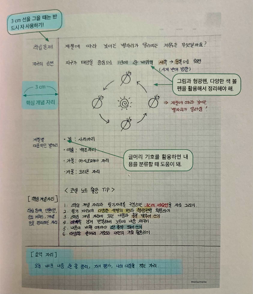 → 수업 중에 선생님이 중요하다고 하신 것은 별표★를 하고, 그 옆에 핵심 내용을 간단히 정리한다. 잘 이해가 안 되는 것은 물음표?, 이미 배운 내용과 연결되는 부분이 나올 때는 연결되는 쪽수나 단원명을 함께 적어 복습하고, 중요한 내용은 형광펜이나 색볼펜을 활용한다.