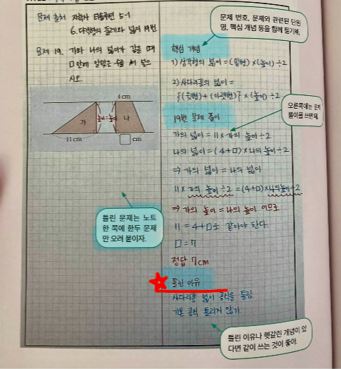 오답노트, 이렇게 써야 효과 있다 그리드노트를 반으로 나눠, 왼쪽에 문제를 적거나 붙이고, 오른쪽에 풀이과정, ★틀린 이유, 개선방안을 적는다.