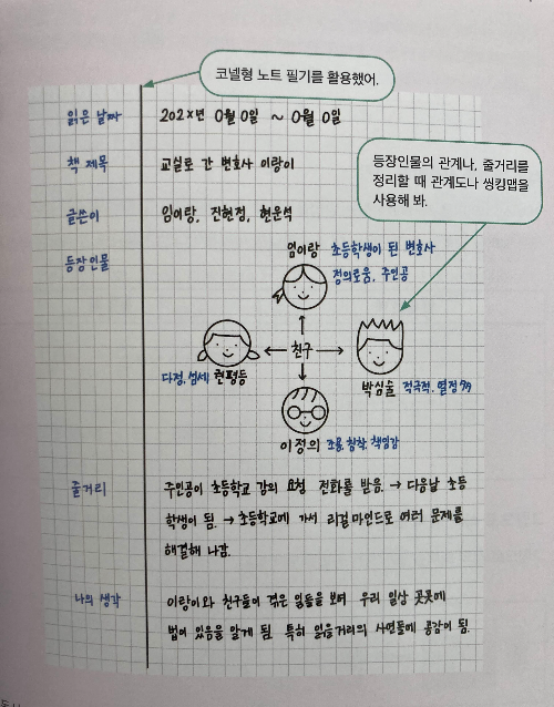 핵심개념 정리하기 핵심개념은 전체 내용을 여는 열쇠야. 코넬형 노트 왼쪽에 "키워드"를 적고 왼쪽에 내용을 정리해 보자.