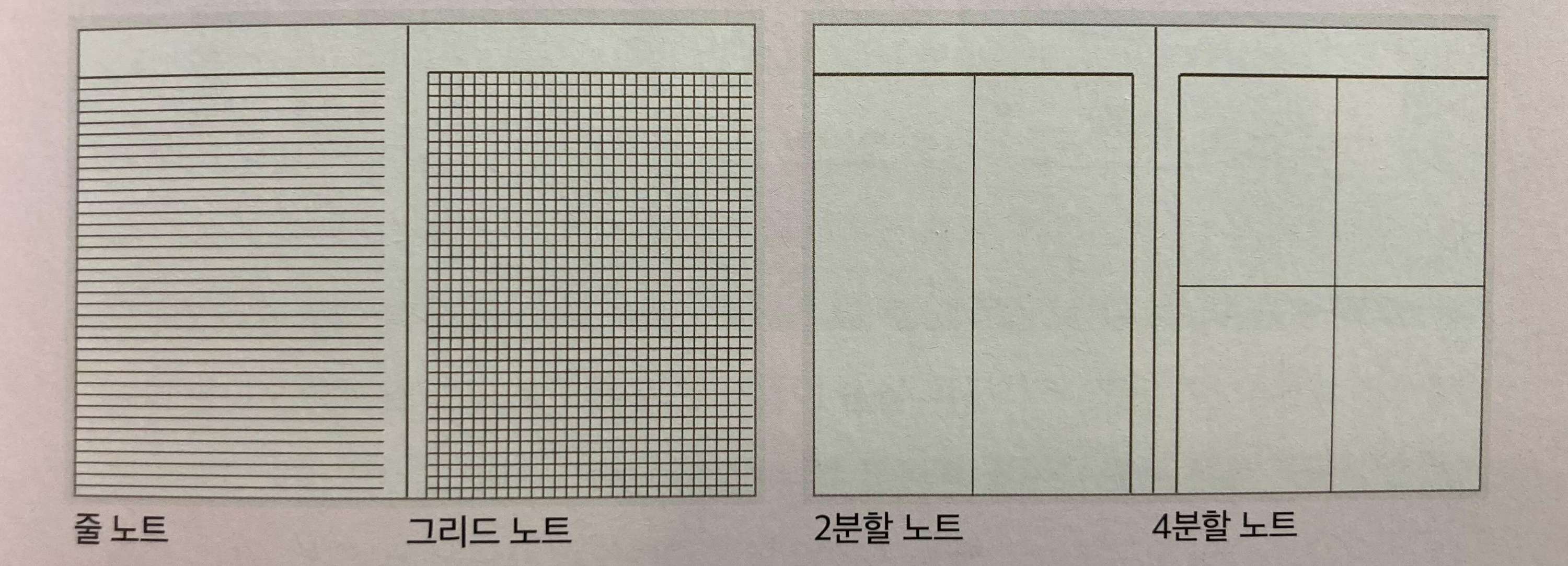 줄노트, 그리드 노트(모눈 노트),2 분할/4 분할 노트(T자형 노트필기나 오답노트로 활용)가 있는데, 선이나 표를 그릴 때 유용해서"그리드 노트"가 중고등학생이나 대학생들이 가장 많이 사용하는 노트이기도 하다.