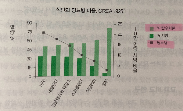 → 전 세계 대부분은 심장질환이 없으며, 그들은 지방과 콜레스테롤이 적은 식생활을 한다. 지방과 콜레스테롤의 과다섭취는 동맥경화증을 유발하고, 혈중 콜레스테롤 증가시키며 이는 심장질환의 원인이 된다.