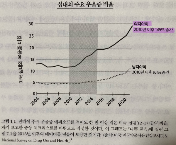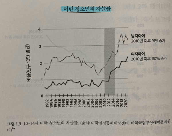 아이들의 놀이가 모두 작은 화면 속으로 들어갔으니, 겉으로 보기엔 안전해진 환경이 되었지만, 그 사라진 외면문제가 다 정신문제로 증폭되어 나오고 있네요. 책에 첨부된 표를 보고 심각성을 더 느꼈습니다. 미국, 유럽, 캐나다의 문제가 아니라 전 세계적으로 문제입니다.