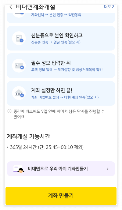 (저는 KB증권을 사용하고 있어서) KB증권 어플에서 계좌개설로 들어가 [비대면 우리 아이 계좌 만들기]를 찾아 선택합니다.