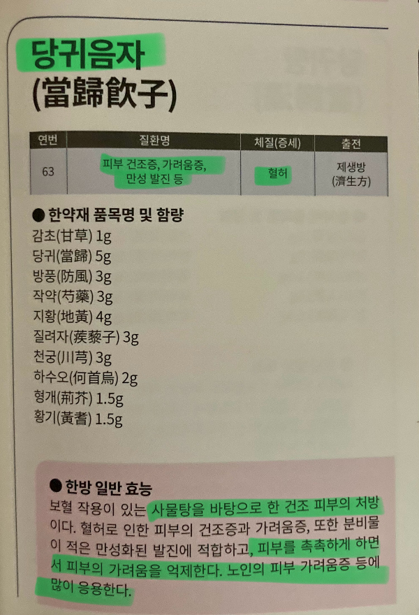 → 사물탕(당귀, 천궁, 작약, 지황)의 4가지 약재는 간 기능, 보혈·양혈·행열작용을 한다.