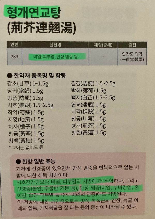 → 당귀음자탕/ 십미패독탕/ 온청음/ 소풍산/ 용담사간탕/ 자운고/ 형개연교탕 / 황련해독탕
