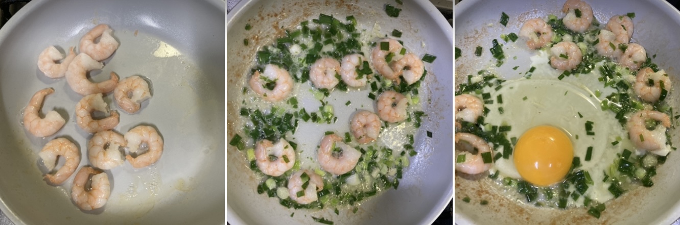 1. 팬에 기름을 두르고 (냉동된) 칵테일새우를 먼저 익히고, 다진쪽파를 반만 넣어 파기름도 낸다. 계란도 하나 깨 넣는다.