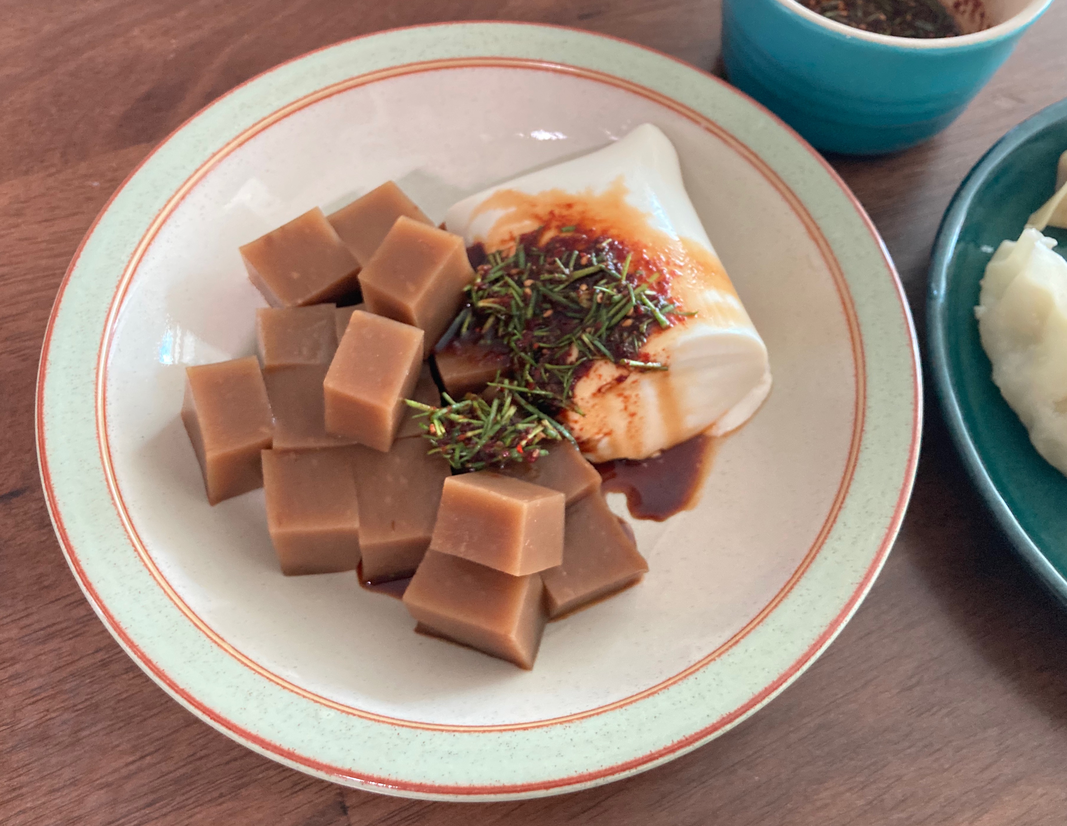 묵 위에 참나물, 세발나물 등을 무쳐서 같이 드셔도 좋아요. (간장+설탕+고춧가루+참기름+깨)