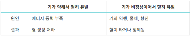 - 기가 과하게 소모되는 “기항(氣亢)”은 혈을 열로 태워 혈액을 소모함. 혈생성도 저하시킴.