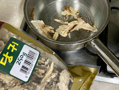 하루 지나도 효과가 없는 듯하여, 마트에서 당귀(뿌리)를 사서 물처럼 끓여주었어요. 사물탕에 들어있는 당귀가 혈을 보하고, 혈관 확장 및 순환, 즉 간과 피부에 좋다 해서요. (간이 혈을 담당)