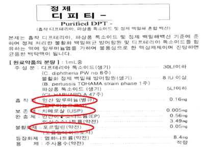 발작, 치매, 뇌손상 등을 일으키는 물질로 DTP, 소아마비, B형 간염백신 등의 방부제로 사용됩니다. 이 외에도, 벤제토니엄 클로라이드, 에틸렌글리콜(방부제), 알레르기 유발물질(젤라틴, 네오마이신), 페놀(살균제, 방부제), 스트렙토마이신(알레르기) 등등 유해물질은 셀 수 없이 많습니다.