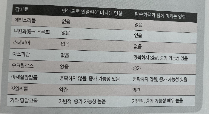 스테비아, 에리스리톨, 나한과(몽크 프루트) 추출물은 아무 영향이 없습니다. 주부님들은 건강을 위해서 아가베 시럽, 메이플 시럽, 꿀 등을 사용하시는데, 이러한 것들도 이 책에선 피해야 할 식재료로 나와 있네요 (p263) 흠… 전 잘 모르겠네요. ;;