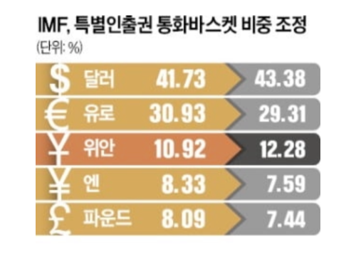 기존 특별인출 바스켓은 달러, 유로, 엔, 파운드로 이루어져 있고, 2015년 11월 국제통화기금 이사회가 중국의 위안을 기준통화로 특별인출권 바스켓에 포함시켰다. 2022년 현재 위안화 비중은 12.28%로 높일 예정이다.