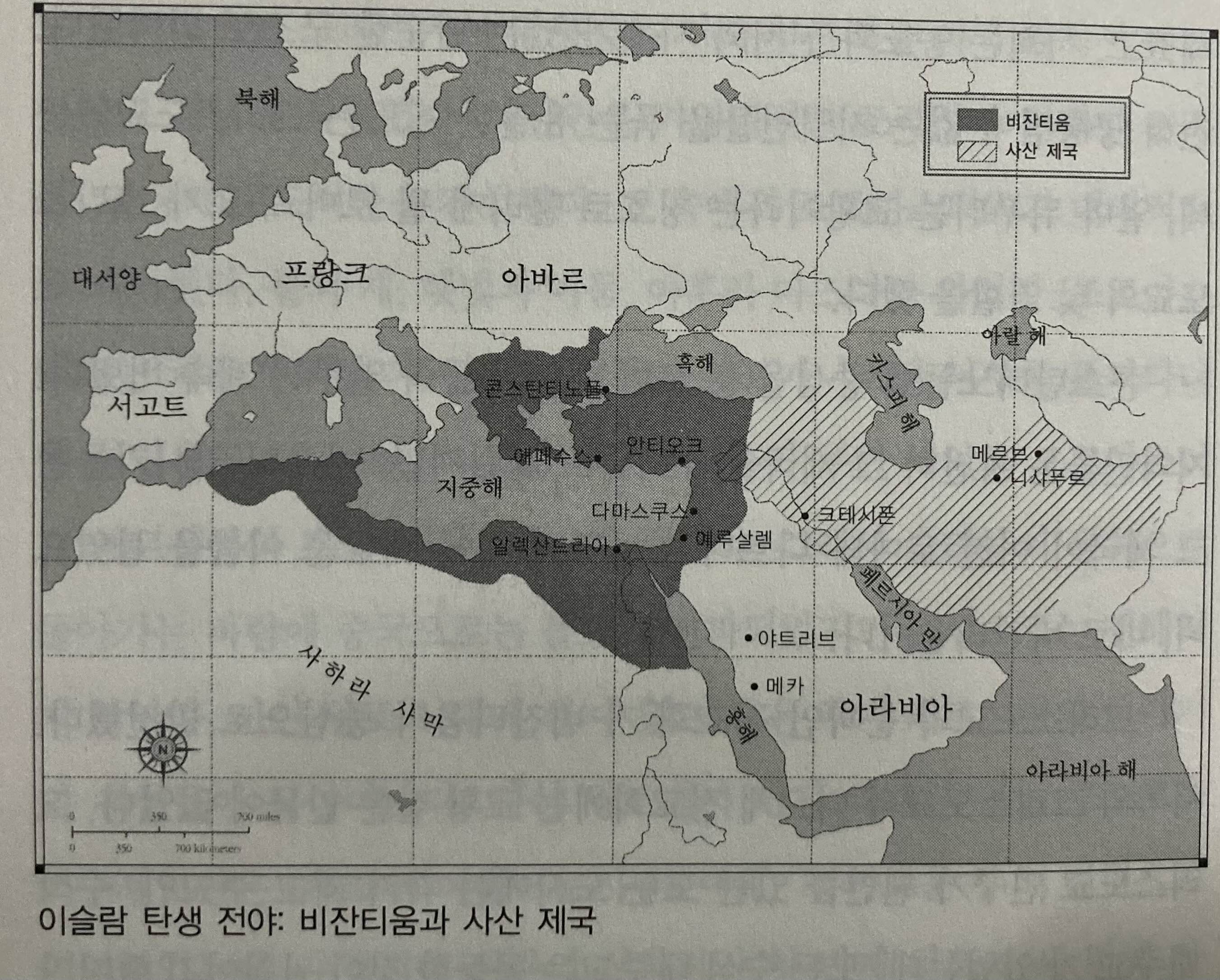 비잔티움, 사산제국 사이, 두 세계의 역사가 중첩되면서 오늘날까지 고질적인 분쟁이 이어져 오고 있다. 이것이 이슬람이 태어나기 직전 중간세계의(중동) 배치도이다.