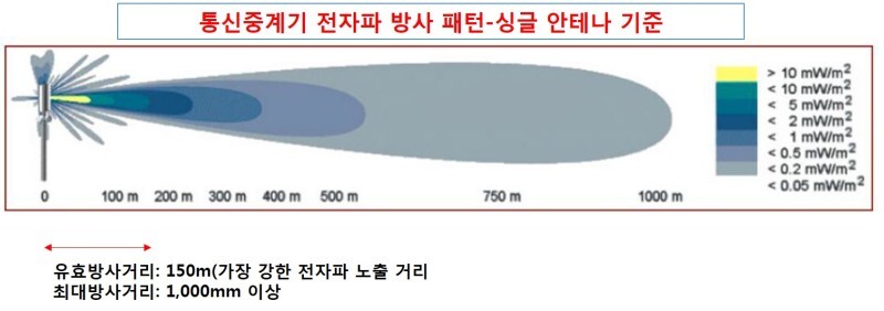 아래 그림을 보면 아시겠지만, 중계기 정면이 가장 위험하고, 측면은 절반으로 줄어들며, 중계기 뒷면은 조금만 떨어져도 안전해 보입니다. 정면은 1000m는 떨어져야 안전하군요. 하지만 중계기가 하나만 있는 것도 아니고, 주변에서 전파가 복합적으로 방사되기에 잘 고려해서 판단해야겠지요. 금속물이 중간에 있을경우 전파가 많이 줄어듭니다. 아파트 방충망을 치고 안치고에 따라서 전자파 강도가 확연하게 줄더라고요. 유리(창문)는 차폐가 안되고요. 그러고 보니, 아이와 잘 때 겨울에는 텐트 속에서 잤는데 (아이가 좋아함. 호흡기 건강에도 도움) 텐트 중간중간 금속물질이 전파를 흡수한 건지, 아님 최근에 전파가 강해진 건지, 요즘 텐트 밖에서 자는데 잠을 잘 못 자요...ㅜㅜ