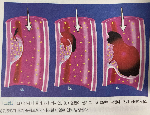 심장마비의 가장 위험한 것은 덩치 큰 플라크가 아니라 작은 지방질의 플라크다. 플라크는 아주 얇은 섬유질피막에 쌓여있는데, 그 피막이 터져서 고름 같은 성분이 혈액으로 새어 나오면 혈전반응이 일어나고, 혈소판이 이를 응고시켜 몇 분 만에 동맥을 막을 수 있다. 그러면 심장이 멈추고 (=심근경색, 심장마비), 심장 마비가 여러 번 오면 심장기능이 저하되는 울혈성심부전이 된다.