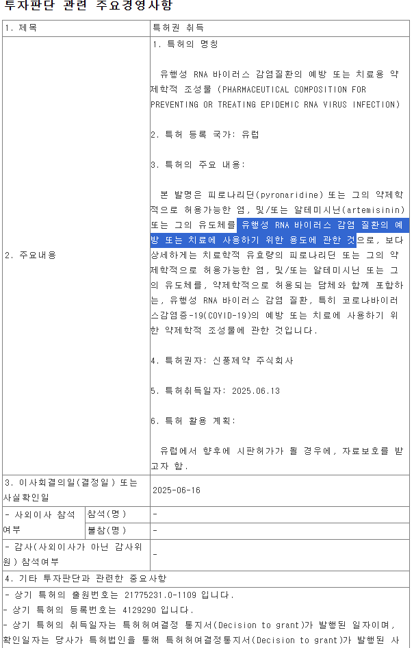 신풍제약은 2023년 7월 OAPI(아프리카 지적재산기구) 소속 17개국에서 유행성 RNA 바이러스 감염 질환에 대해 동일 조성물 특허를 등록했으며 올해 3월에는 중국에서 코로나19 및 메르스 감염에 대해 동일 조성물의 특허 등록을 완료했다.]