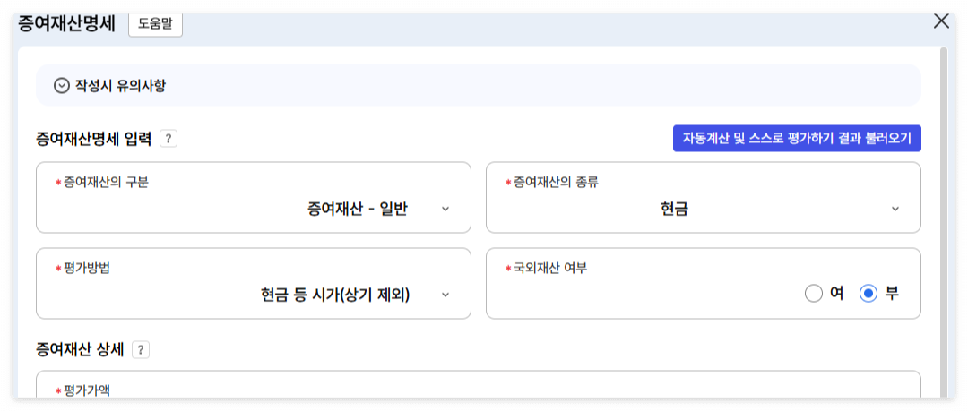 → 증여재산 명세 입력 (증여재산-일부 / 현금 / 현금 등 시가 선택/ 금액 입력 후, [입력완료] 클릭)