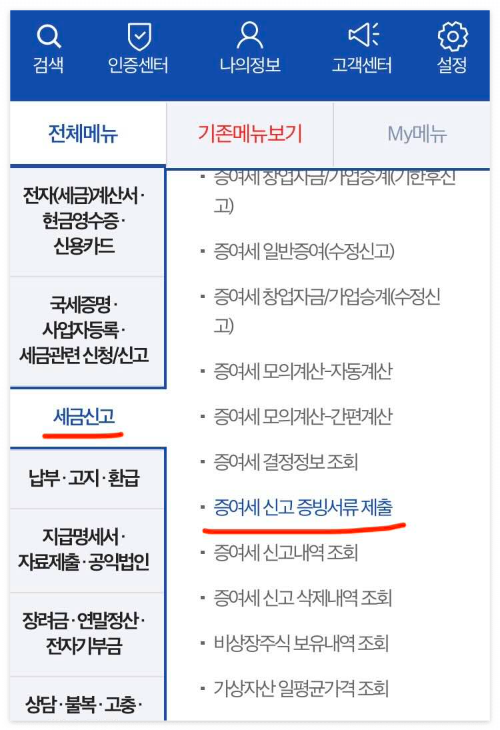 > 모바일 → 전체메뉴 → 세금신고 →증여세신고