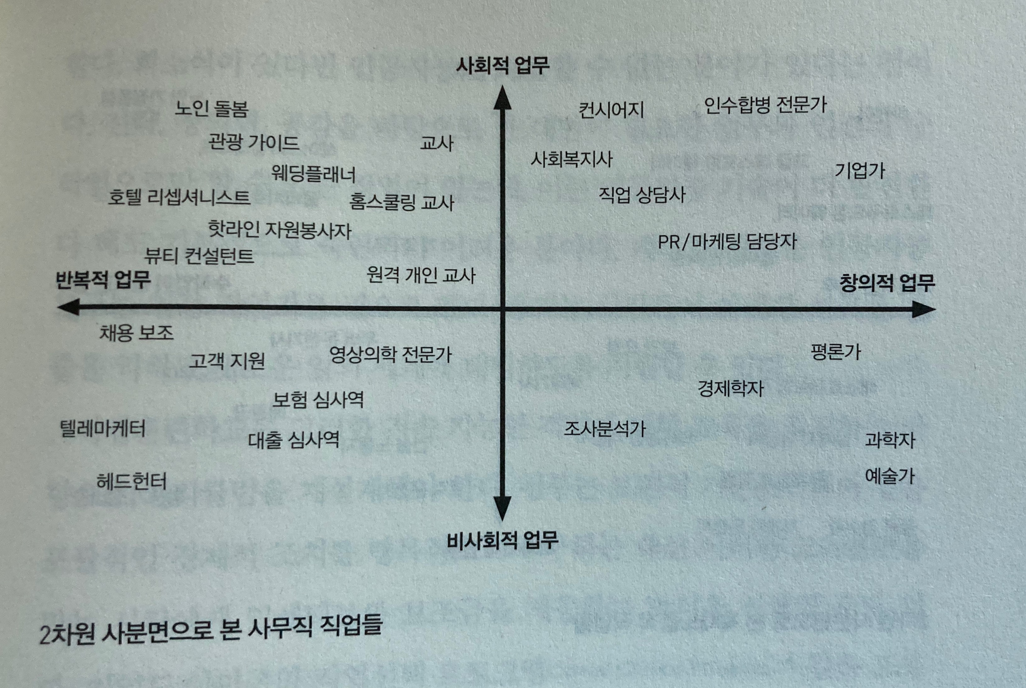 창의적이고 사회적인 업무는 인간이 더 유리한 분야이고, 반복적이고 비사회적인 업무는 인공지능이 훨씬 더 유리한 분야이다.