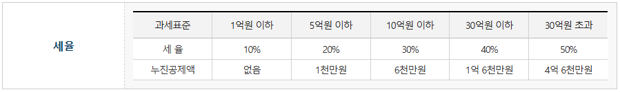자식에게 증여세없이 줄 수 있는 금액한도에 대해 알아보고, 아래와 같이 실행한다면 불필요한 세금을 절약하실 수 있을거라 생각합니다. 아래 증여세율을 보면 1억기준 세금이 1,000만원입니다. 세율이 아주 높지요. 이 세금을 절약하는 방법을 알아보겠습니다.