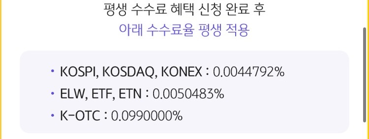 KB증권은 국내주식 온라인 수수료 평생혜택이 있습니다. 계좌개설 후 3개월 이내 "평생수수료 혜택신청"을 하면, 아래 수수료율이 평생 적용된다고 합니다.